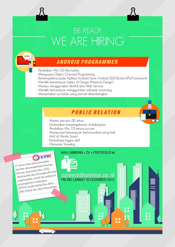 SEVIMA.COM – Halo rekan, Untuk Kamu yang menyukai traveling, otak atik social media dan mempunyai kemampuan komunikasi yang baik. SEVIMA kembali membuka lowongan pekerjaan sebagai Public Relation, dan Android Programmer untuk kamu-kamu yang mempunyai kemampuan dalam UI design, mampu menggunakan restfull/web service, menguasai object oriental programming, mampu menggunakan software versioning, dll. Segera kirimkan Lamaran, CV dan fortofolio ke alamat email careers@sevima.co.id, paling lambat 30 Desember 2015.