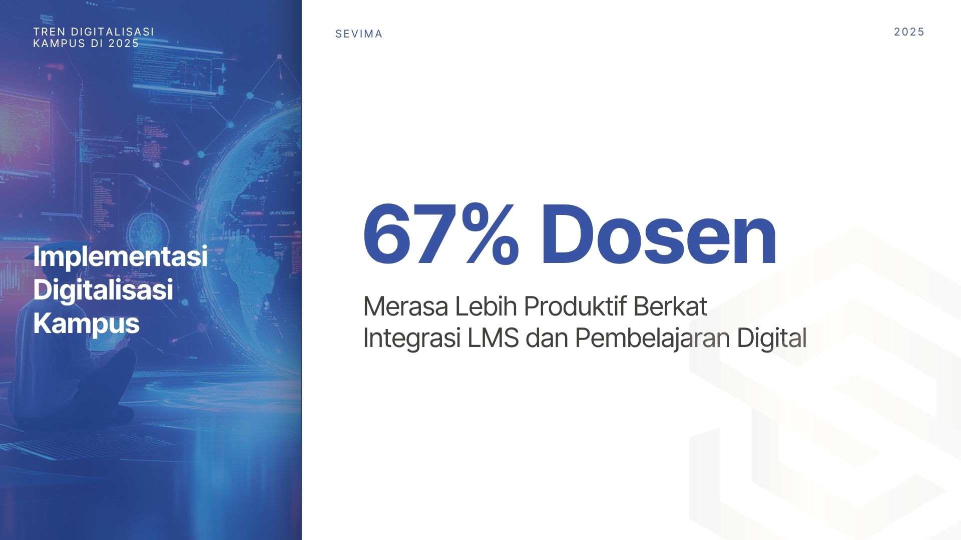 Integrasi Learning Management System (LMS) dan pembelajaran digital terbukti meningkatkan produktivitas dosen secara signifikan, dengan 67% dosen menyatakan bahwa mereka menjadi lebih efisien dan fleksibel dalam mengelola proses pembelajaran. LMS memungkinkan distribusi materi, penilaian, komunikasi, serta monitoring mahasiswa dilakukan secara lebih terstruktur dan otomatis, sehingga beban administratif dosen berkurang dan fokus pada pembelajaran meningkat.