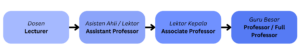 Lecturers typically begin at the ‘lecturer’ title, and may progress through the ranks by fulfilling the required academic, research, and service obligations. Each promotion requires the accumulation of a minimum number of credit points (angka kredit), as stipulated by the Minister of Administrative and Bureaucratic Reform Regulation Number 17 of 2013.