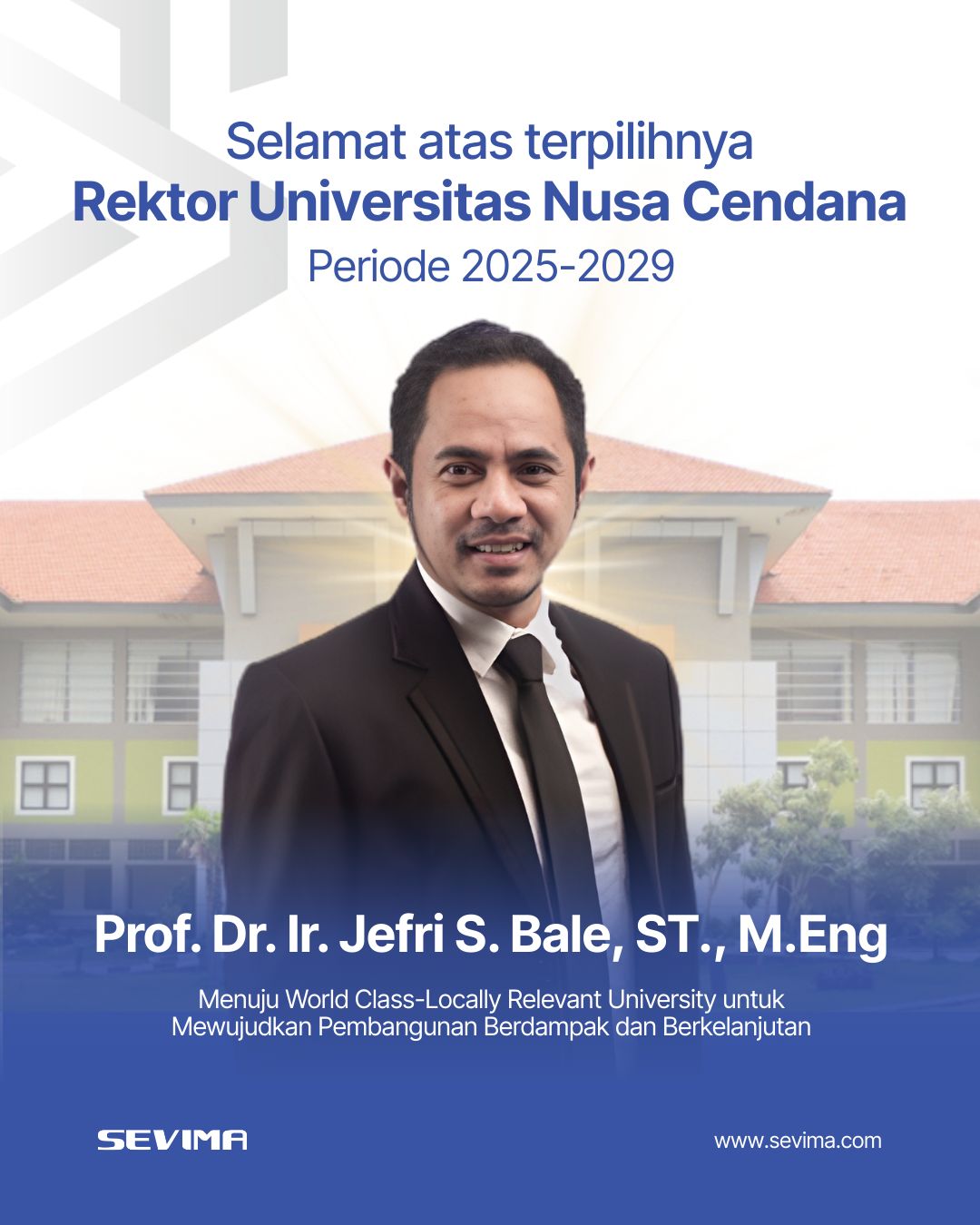 Senada, Instagram UNDANA mengungkapkan bahwa Prof. Dr. Ir. Jefri S. Bale, S.T., M.Eng telah resmi terpilih sebagai Rektor Universitas Nusa Cendana periode 2025-2029. Disebutkan dalam instagram bahwa ini adalah amanah besar yang dipercayakan melalui pemilihan putaran kedua pada Selasa (2/12/2025). Instagram UNDANA mengajak civitas akademika untuk menyambut, mendukung, serta mendoakan semoga di bawah kepemimpinan beliau, Undana terus mencetak inovasi dan menghasilkan lulusan terbaik!
