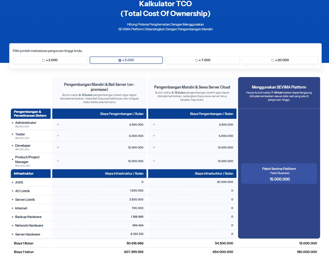 Dari fisiensi biaya mencapai lebih dari 60% dan sistem bisa langsung live hanya dalam dua minggu. Untuk perbandingan berdasarkan kasus jumlah mahasiswa di perguruan tinggi Bapak/Ibu lebih lengkap dapat diakses melalui laman berikut: https://sevima.com/tco-calculator/