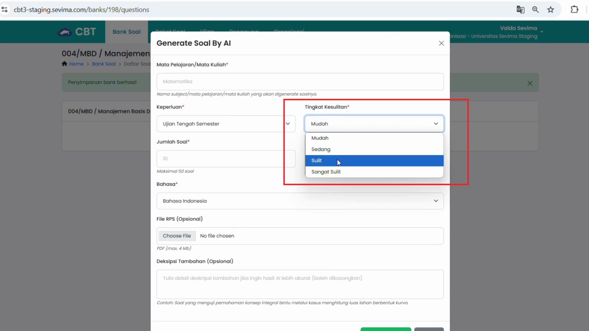 Atur tingkat kesulitan soal di Modul CBT SEVIMA Platform