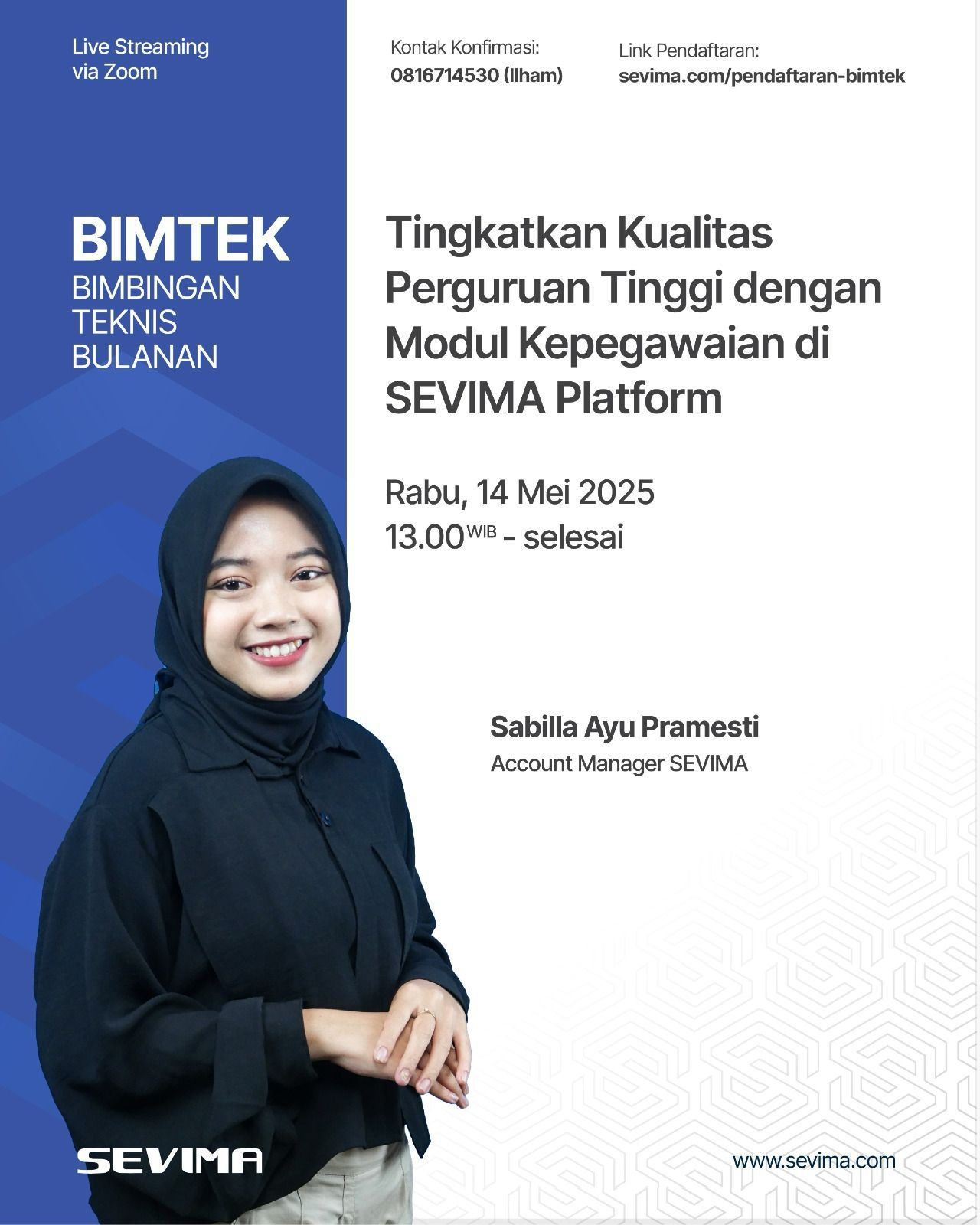 Kami mengundang seluruh pengelola perguruan tinggi untuk mengikuti sesi ini dan memperoleh wawasan praktis mengenai penerapan sistem kepegawaian yang lebih baik menggunakan teknologi SEVIMA. Jangan lewatkan kesempatan untuk meningkatkan proses administrasi kepegawaian di perguruan tinggi Anda!