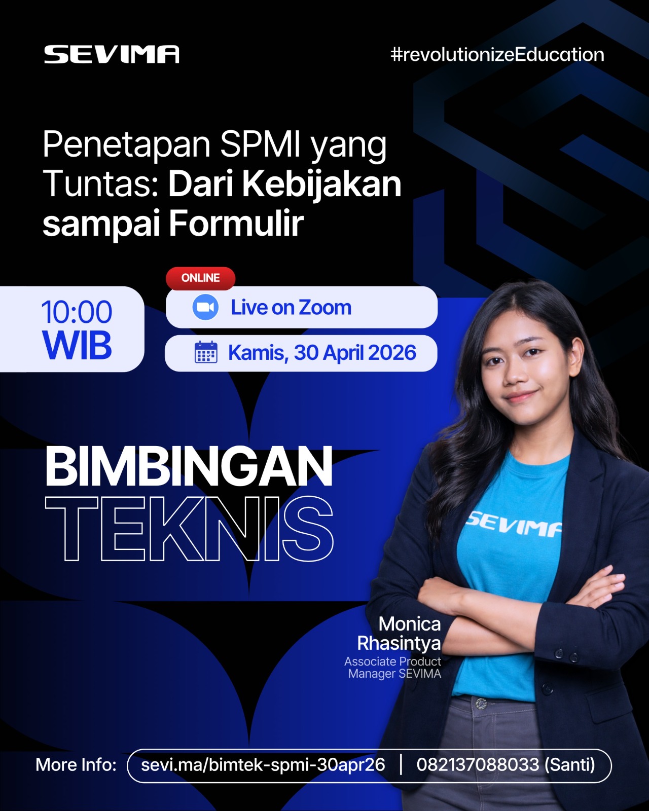 Bersama Monica Rhasintya, Associate Product Manager SEVIMA, peserta akan mendapatkan insight yang relevan dan mudah dipahami terkait penguatan sistem penjaminan mutu internal. Materi dikemas secara sistematis agar membantu peserta meningkatkan kualitas tata kelola akademik secara berkelanjutan.