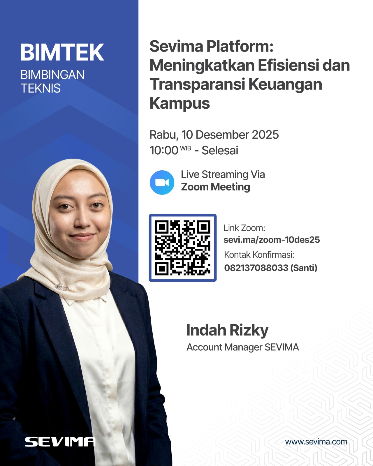 Keuangan perguruan tinggi merupakan salah satu aspek penting yang mendukung kelangsungan operasional dan perkembangan kampus. Dengan meningkatnya kebutuhan akan akuntabilitas, transparansi, dan efisiensi, institusi pendidikan harus memastikan bahwa pengelolaan keuangan mereka sesuai dengan standar yang berlaku. Dalam upaya memenuhi kebutuhan ini, SEVIMA menghadirkan Bimbingan Teknis (BIMTEK) dengan topik “Sevima Platform: Meningkatkan Efisiensi dan Transparansi Keuangan Kampus.”