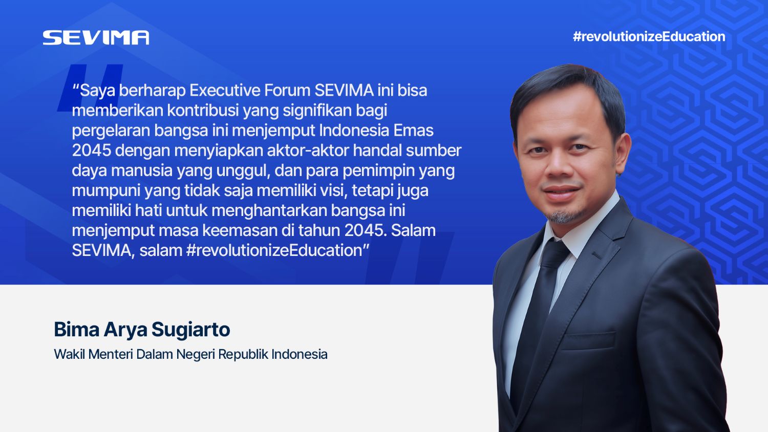 “Saya berharap Executive Forum SEVIMA ini bisa memberikan kontribusi yang signifikan bagi pergelaran bangsa ini menjemput Indonesia Emas 2045 dengan menyiapkan aktor-aktor andal sumber daya manusia yang unggul, dan para pemimpin yang mumpuni yang tidak saja memiliki visi, tetapi juga memiliki hati untuk menghantarkan bangsa ini menjemput masa keemasan di tahun 2045. Salam SEVIMA, salam #revolutionizeEducation,” kata Muhammad Fadhil dalam sambutan yang disampaikan secara daring.