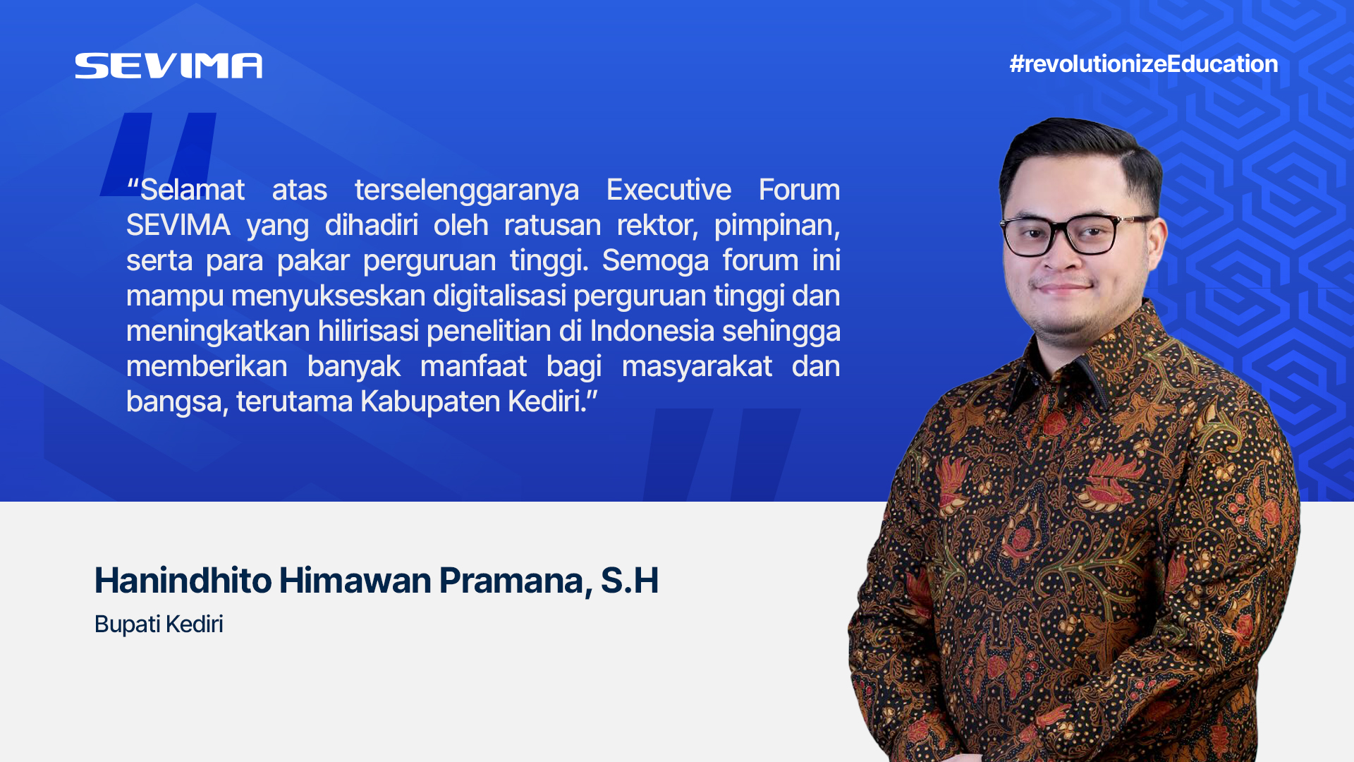 “Selamat atas terselenggaranya Executive Forum SEVIMA yang dihadiri oleh ratusan rektor, pimpinan, serta para pakar perguruan tinggi. Semoga forum ini mampu menyukseskan digitalisasi perguruan tinggi dan meningkatkan hilirisasi penelitian di Indonesia sehingga memberikan banyak manfaat bagi masyarakat dan bangsa, terutama Kabupaten Kediri,” kata Hanindhito dalam sambutan yang disampaikan secara daring.