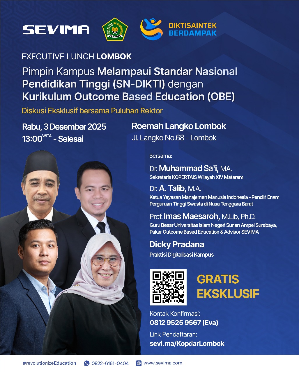 Pada Rabu, 3 Desember 2025, SEVIMA menggelar acara Executive Lunch yang bertajuk “Pimpin Kampus Melampaui Standar Nasional Pendidikan Tinggi (SN-DIKTI) dengan Kurikulum Outcome Based Education (OBE)”. Acara ini diselenggarakan dengan tujuan untuk memberikan wawasan dan diskusi mendalam mengenai penerapan Kurikulum OBE dalam meningkatkan kualitas pendidikan tinggi di Indonesia.