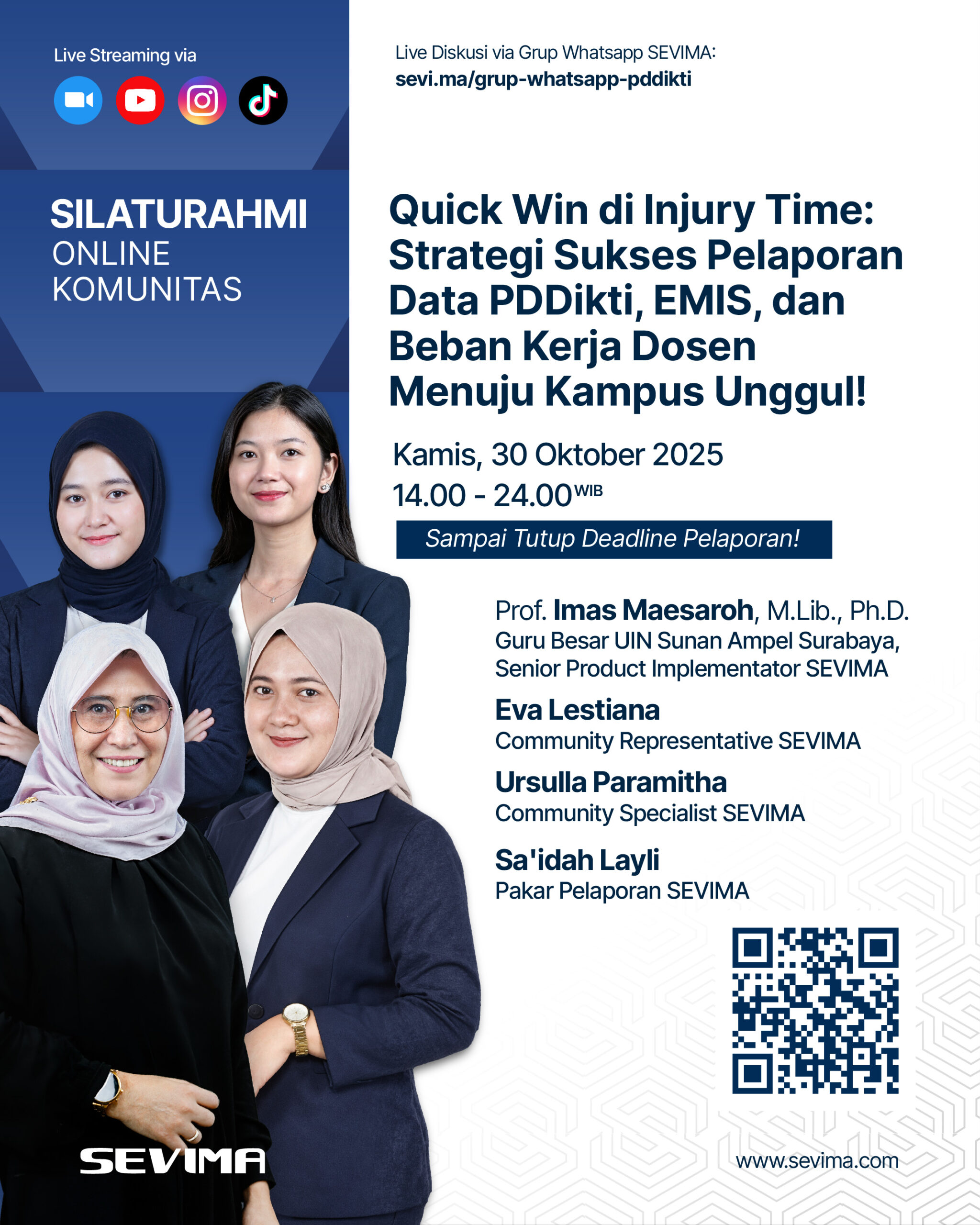 SEVIMA telah sukses menyelenggarakan webinar dengan tema “Quick Win di Injury Time: Strategi Sukses Pelaporan Data PDDikti, EMIS, dan Beban Kerja Dosen Menuju Kampus Unggul” pada hari Kamis, 30 Oktober 2025, yang berlangsung dari pukul 14.00 hingga 24.00 WIB. Webinar ini diselenggarakan dalam format diskusi langsung melalui grup WhatsApp SEVIMA, yang bisa diakses melalui tautan sevi.ma/grup-whatsapp-pddikti, serta dapat disaksikan melalui platform Live Streaming di Instagram, TikTok, dan Facebook.