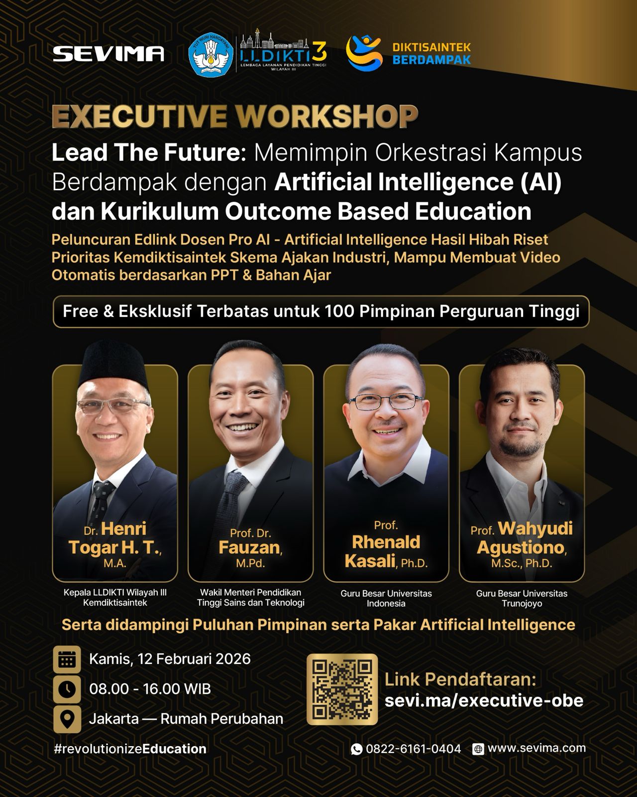 Jangan lewatkan kesempatan langka untuk bergabung dalam Executive Workshop bertema “Memimpin Orkestrasi Kampus Berdampak dengan AI & Kurikulum Outcome-Based Education” yang diselenggarakan oleh SEVIMA bekerja sama dengan LLDIKTI Wilayah III Jakarta dan Dikti Saintek. Acara ini dirancang khusus untuk Pimpinan Perguruan Tinggi, dengan tujuan memberikan wawasan mendalam mengenai peran Artificial Intelligence (AI) dan Outcome-Based Education (OBE) dalam menciptakan sistem pendidikan tinggi yang lebih efisien dan berdampak.