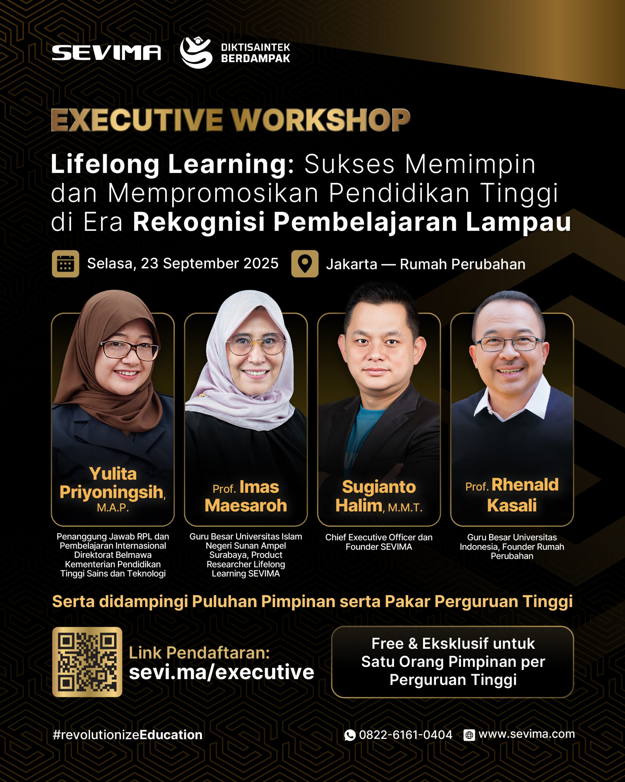 Ikuti Executive Workshop persembahan SEVIMA untuk mengupas tuntas rahasia sukses memimpin dan memajukan perguruan tinggi di era baru ini.
