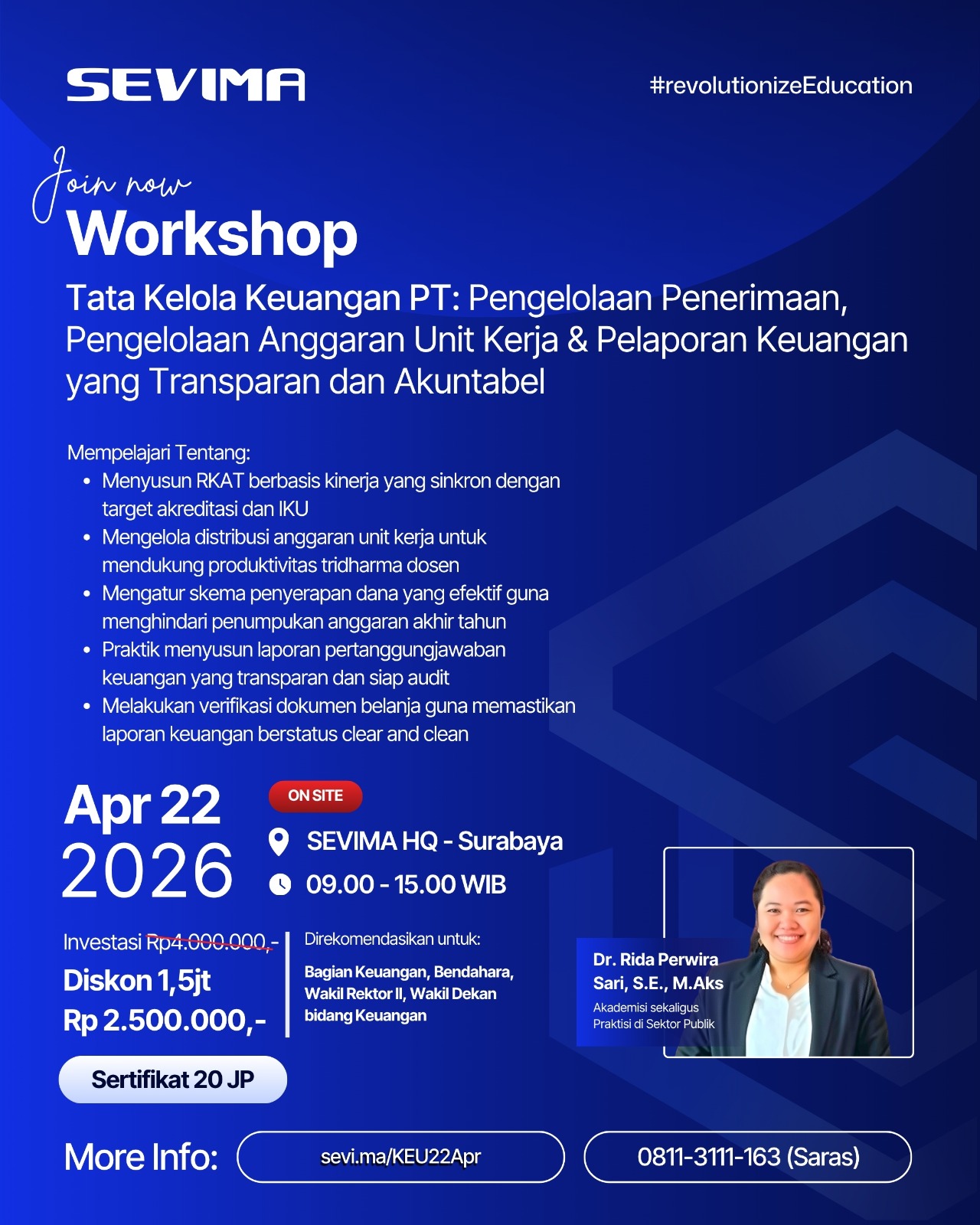 Pendaftaran: Amankan slot melalui tautan berikut: https://sevi.ma/KEU22Apr