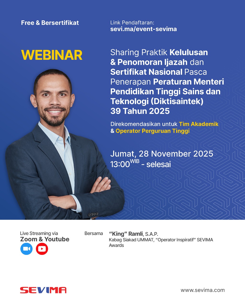Pada hari Jumat, 28 November 2025, SEVIMA sukses menyelenggarakan webinar bertajuk “Sharing Praktik Kelulusan & Penomoran Ijazah dan Sertifikat Nasional Pasca Penerapan Peraturan Menteri Pendidikan Tinggi Sains dan Teknologi (Diktisaintek) 39 Tahun 2025”. Webinar yang dilaksanakan melalui platform Zoom dan YouTube ini diikuti oleh ribuan peserta dengan sangat antusias, khususnya dari kalangan tim akademik dan operator perguruan tinggi.