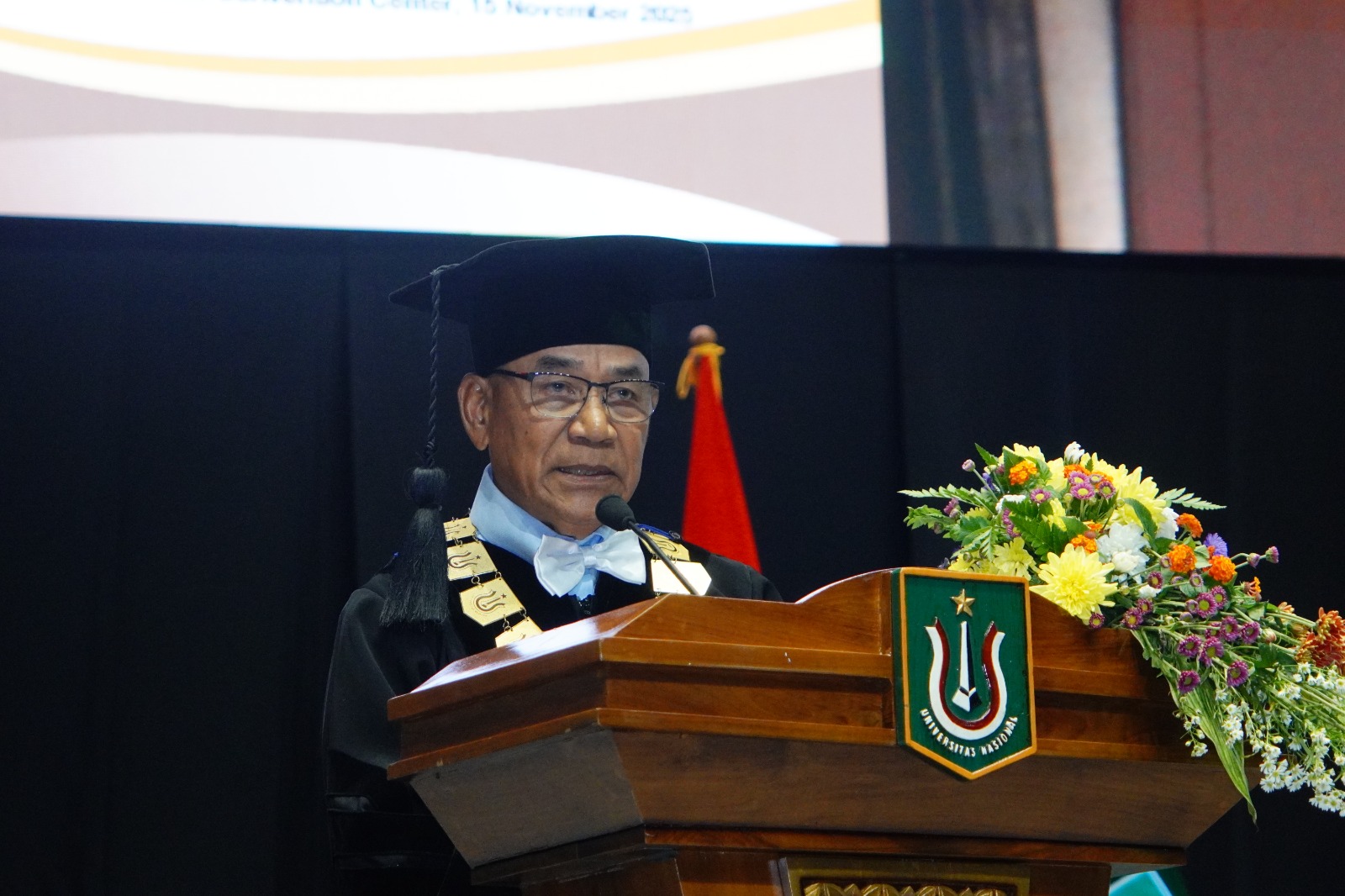 Dalam pidatonya, Rektor UNAS menyampaikan apresiasi dan ucapan selamat kepada seluruh lulusan atas capaian akademik yang diraih. “Hari ini menandai capaian yang istimewa, hasil dari ketekunan, kerja keras, serta doa yang tiada henti. Kebahagiaan dan kebanggaan atas keberhasilan ini juga patut disematkan kepada para orang tua dan keluarga yang dengan tulus memberikan dukungan, pengorbanan, serta kasih sayang sepanjang perjalanan studi para wisudawan,” ujarnya.