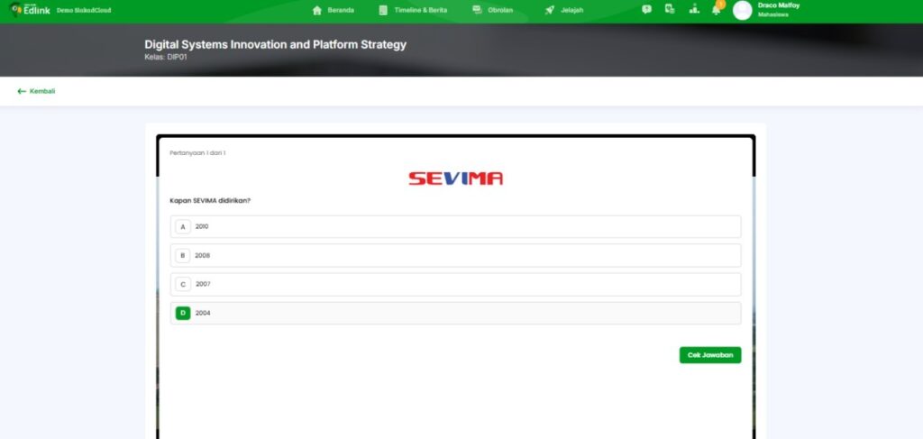 Melalui permasalahan ini, SEVIMA merancang platform pembelajaran Edlink yang dirancang untuk mendukung desain pembelajaran kolaboratif secara praktis dan efisien. Dengan berbagai fitur canggih, Edlink memungkinkan dosen untuk merancang kegiatan pembelajaran yang mendorong mahasiswa untuk aktif berpartisipasi, berkolaborasi, dan mengembangkan keterampilan penting yang akan mereka gunakan di masa depan.