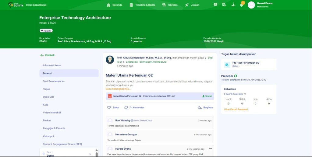 SEVIMA Edlink hadir dengan berbagai fitur yang mendukung pembelajaran kolaboratif secara efektif dan efisien. Berikut adalah beberapa fitur unggulan yang dapat digunakan oleh dosen dan mahasiswa: