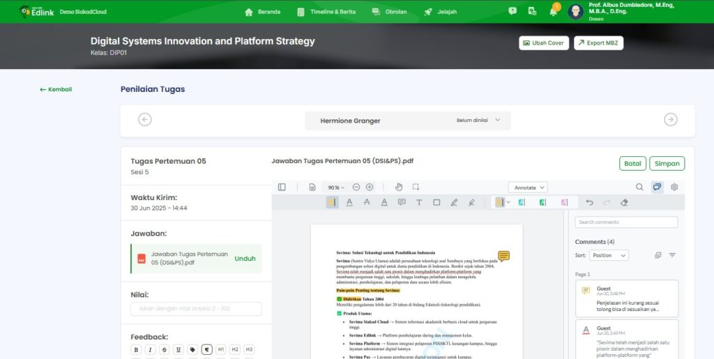 Dosen dapat menilai dan memberikan masukan kepada tugas mahasiswa yang di-upload, yang bukan hanya berguna untuk meningkatkan kualitas tugas, tetapi juga berfungsi sebagai bagian dari penilaian formatif.