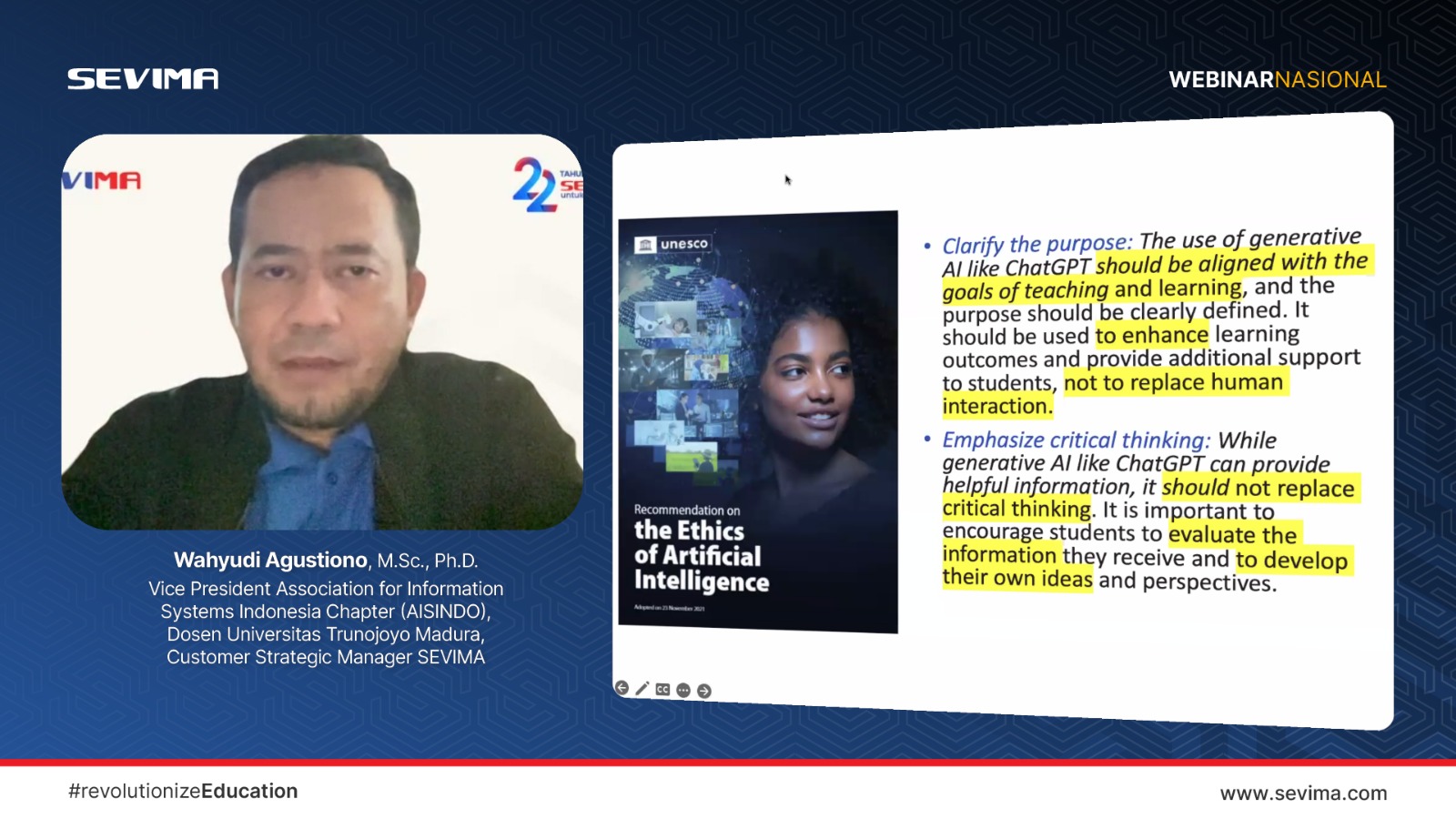 Untuk memfasilitasi AI bagi dunia pendidikan, Wahyudi bersama Dr. Alim Sumarno, M.Pd selaku Direktur Inovasi Pembelajaran Digital Universitas Negeri Surabaya yang juga Pakar SEVIMA, berbagi tiga tips memanfaatkan AI di Webinar SEVIMA. Berikut tipsnya: