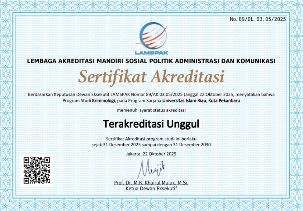 SEVIMA.COM – Program Studi (Prodi) Kriminologi Fakultas Sosial dan Ilmu Politik (FISIPOL) Universitas Islam Riau (UIR) resmi meraih akreditasi UNGGUL dari Lembaga Akreditasi Mandiri Sosial dan Politik Administrasi dan Komunikasi (LAMSPAK) melalui keputusan Dewan Eksekutif LAMSPAK nomor 89/AK.03.05/2025. Sertifikat akreditasi program studi berlaku sejak 31 Desember 2025 hingga 31 Desember 2030.