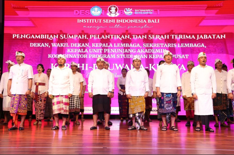 SEVIMA.COM – Institut Seni Indonesia Bali (ISI BALI) menyelenggarakan pelantikan dan pengambilan sumpah/janji jabatan bagi para pejabat baru periode 2025–2029, yang meliputi dekan dan wakil dekan, ketua dan sekretaris lembaga, koordinator program studi, kepala unit penunjang akademik, serta kepala pusat. Kegiatan berlangsung di Ballroom Kirtya Sabha Mahottama, Gedung Citta Kelangen Lantai 3 ISI BALI, pada Senin (Soma Umanis, Wuku Tolu Purnaming Sasih Kapat), 6 Oktober 2025.