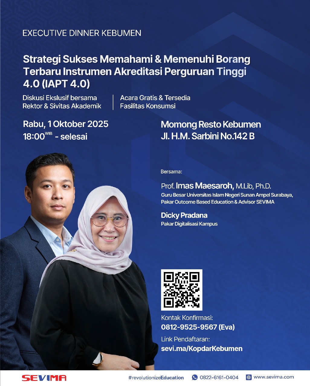 Kebumen — SEVIMA telah menyelenggarakan Executive Dinner Kebumen dengan tema “Strategi Sukses Memahami & Memenuhi Borang Terbaru Instrumen Akreditasi Perguruan Tinggi 4.0 (IAPT 4.0)” pada Rabu, 1 Oktober 2025 pukul 18.00 WIB hingga selesai, bertempat di Momong Resto Kebumen, Jl. H.M. Sarbini No.142 B.