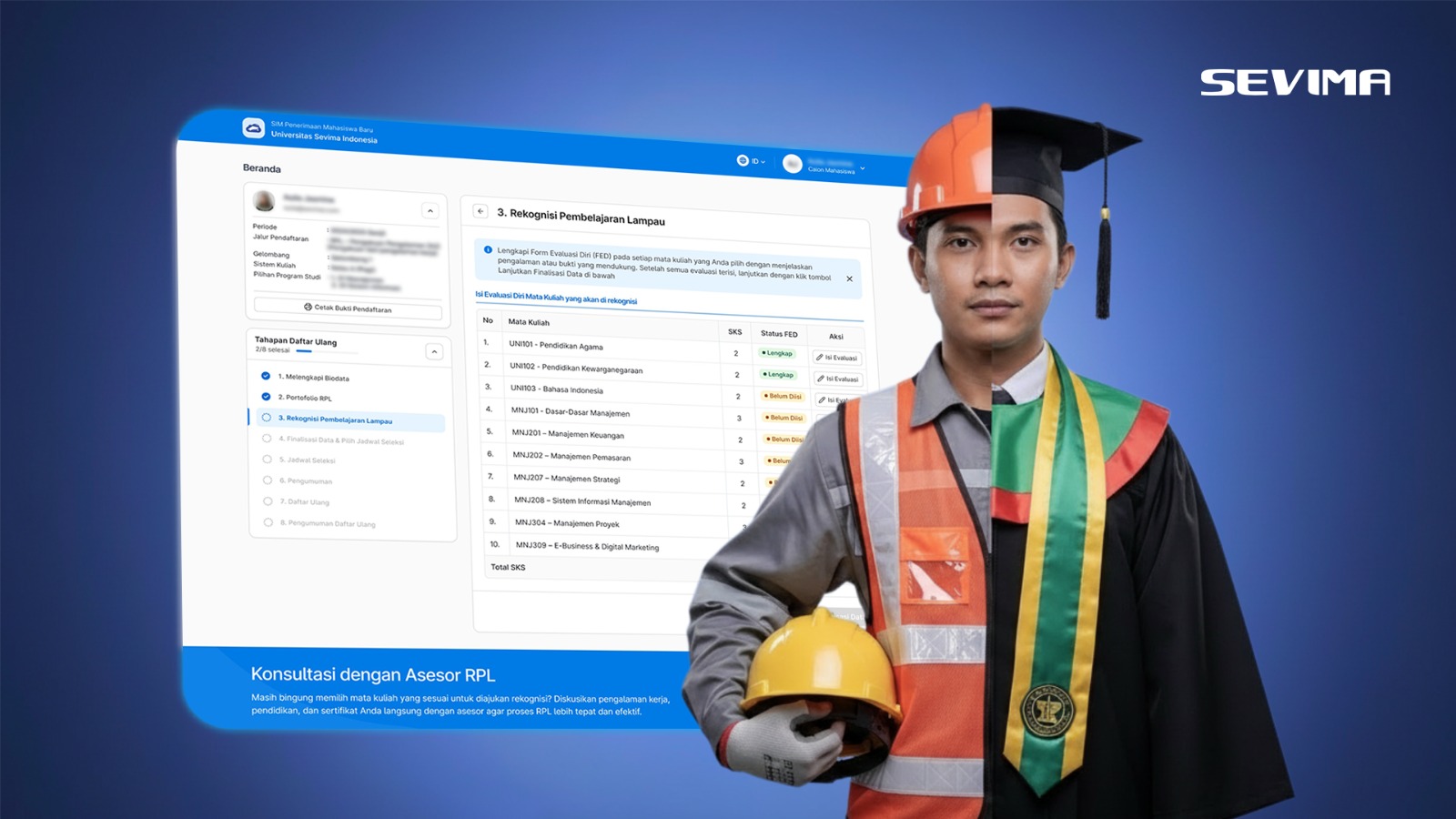 Sebagai penyedia solusi teknologi pendidikan, SEVIMA menghadirkan platform terintegrasi yang dirancang khusus untuk mengakomodasi proses RPL secara menyeluruh, termasuk pengisian FED, penilaian asesor, hingga kebutuhan pelaporan.