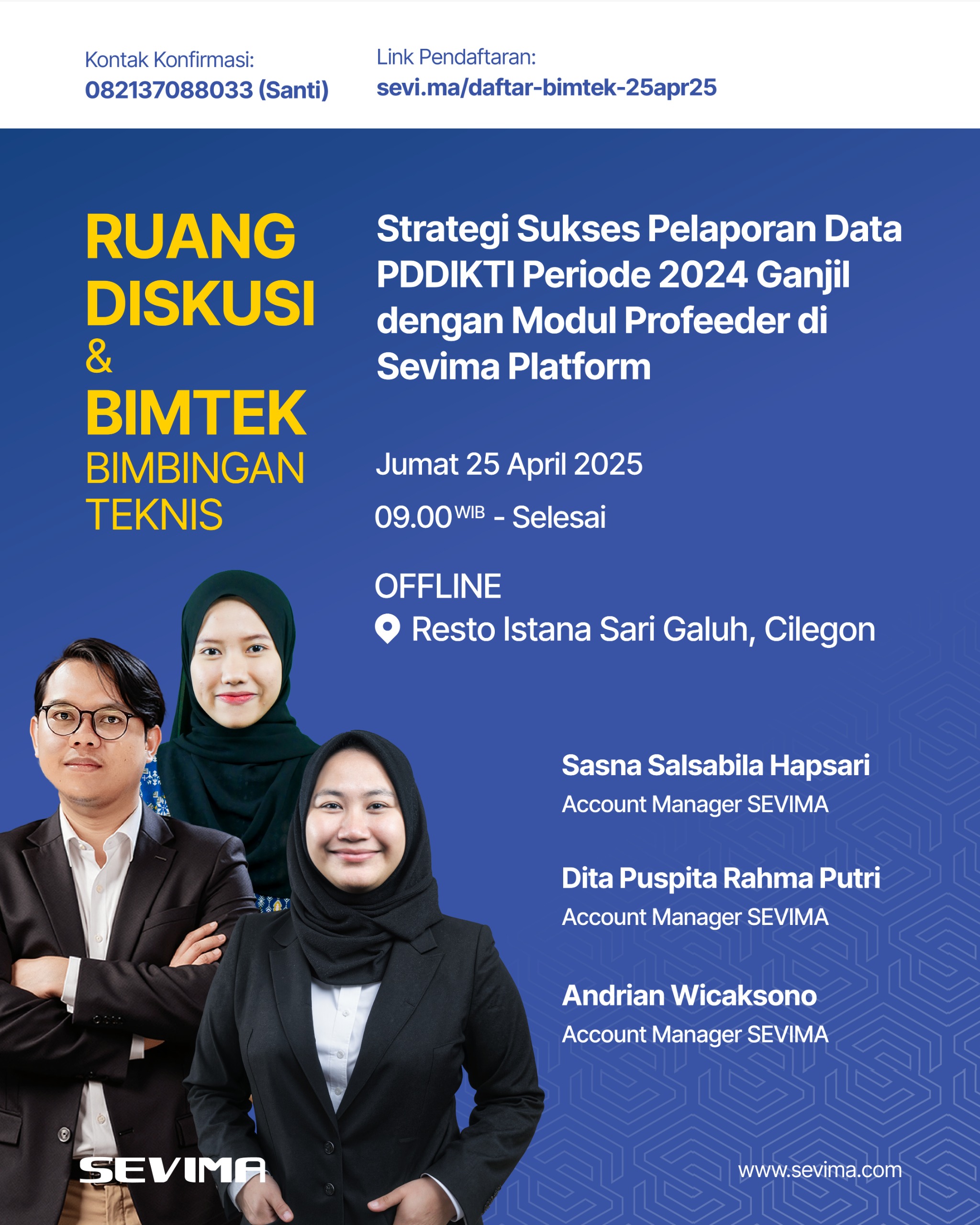 Dalam acara ini, Sasna Salsabila Hapsari, Dita Puspita Rahma Putri, dan Andrian Wicaksono, Account Managers SEVIMA, akan membagikan pengetahuan dan pengalaman terkait cara menggunakan dan mengoptimalkan Modul Profeeder untuk pelaporan data PDDIKTI yang lebih cepat dan efisien. Dengan Modul Profeeder yang tersedia di SEVIMA Platform, perguruan tinggi dapat memastikan bahwa proses pelaporan data akademik sesuai dengan regulasi dan standar yang ditetapkan oleh Kementerian Pendidikan dan Kebudayaan (Kemendikbud) ✅.