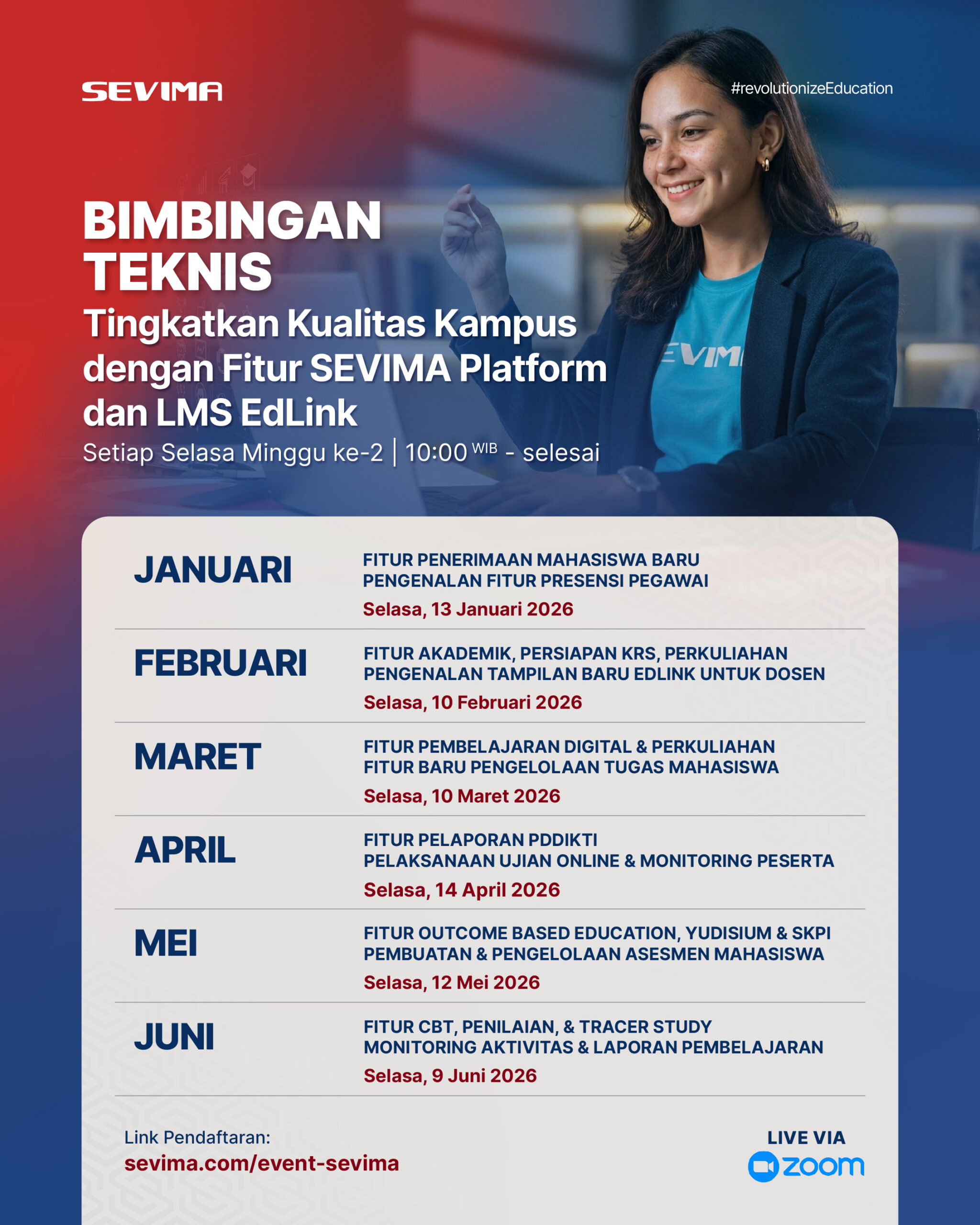 Dalam upaya mendukung transformasi digital pendidikan tinggi di Indonesia, SEVIMA mempersembahkan serangkaian Bimbingan Teknis yang dirancang khusus untuk membantu perguruan tinggi mengoptimalkan pengelolaan kampus secara menyeluruh. Program ini hadir dengan fokus pada peningkatan kualitas layanan akademik, administrasi, dan pembelajaran digital melalui pemanfaatan teknologi terkini.