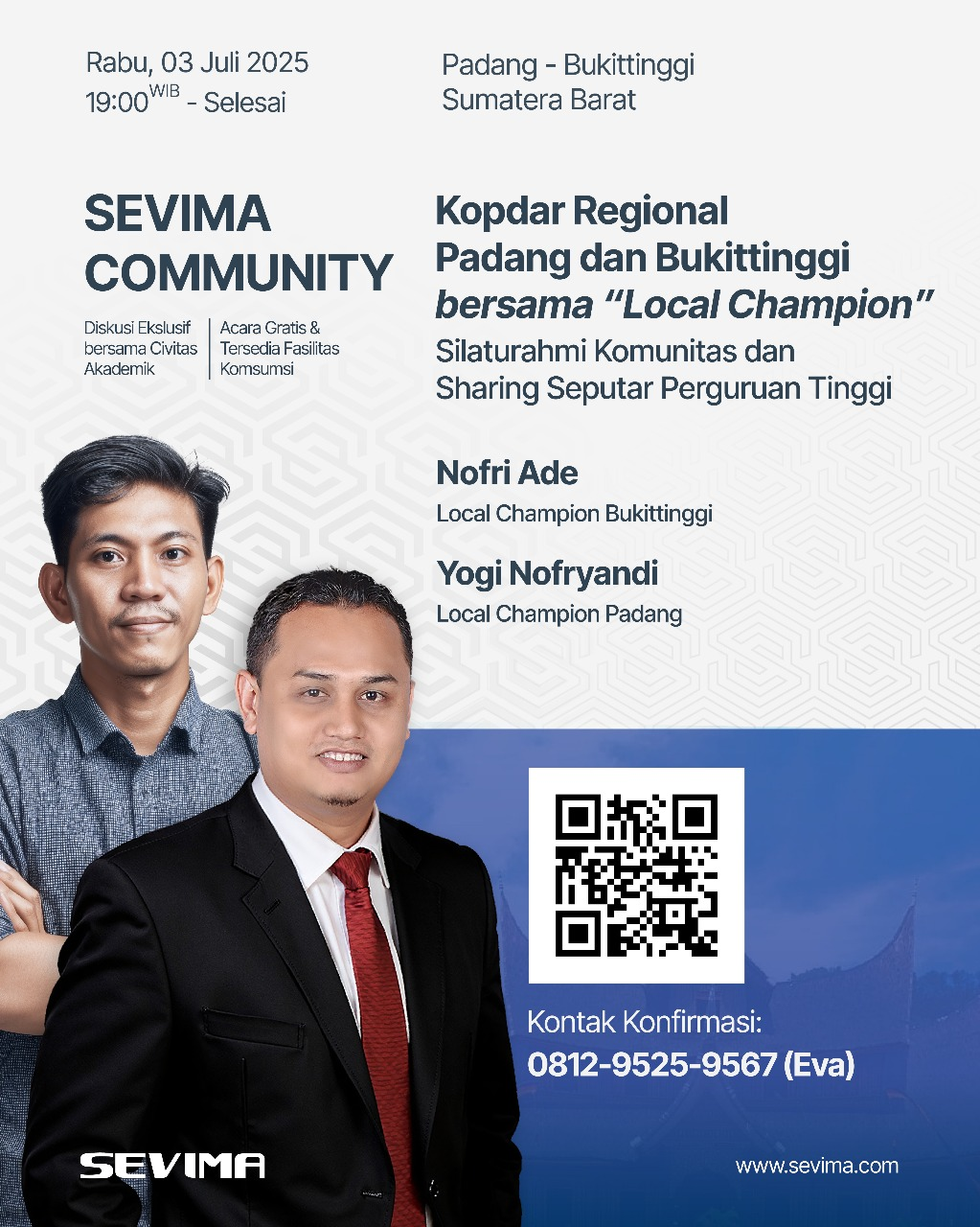 Kami sangat antusias mengundang Anda dalam Kopdar Regional SEVIMA Community yang akan mempertemukan para ‘Local Champion’ pendidikan tinggi di Sumatera Barat!