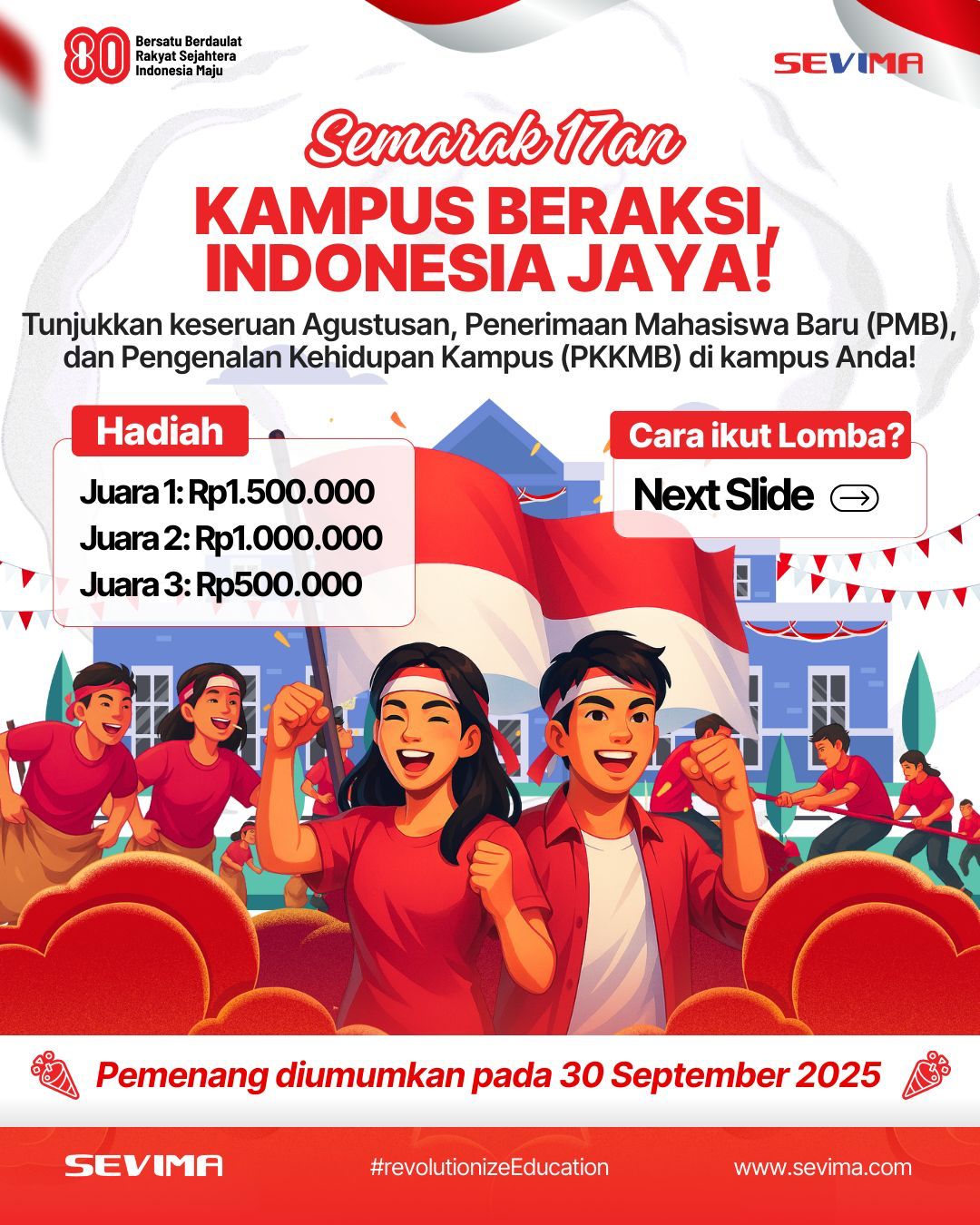 SEVIMA.COM – Dalam rangka memeriahkan HUT ke-80 Kemerdekaan Republik Indonesia, SEVIMA menggelar lomba bertajuk “Semarak 17an: Kampus Beraksi, Indonesia Jaya!.” Kegiatan ini mengajak seluruh civitas akademika di berbagai perguruan tinggi untuk mendokumentasikan momen kebersamaan dalam perayaan Agustusan, Penerimaan Mahasiswa Baru (PMB), serta Pengenalan Kehidupan Kampus (PKKMB).