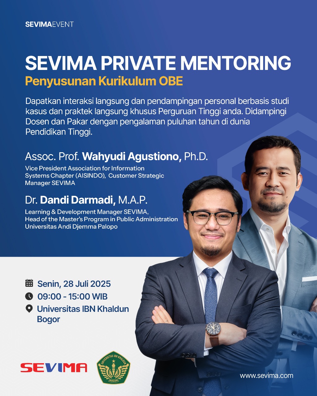 Acara ini akan menghadirkan Assoc. Prof. Wahyudi Agustiono, Ph.D. (Vice President for Information Systems Chapter AISINDO, Customer Strategic Manager SEVIMA) dan Dr. Dandi Darmadi, M.A.P. (Learning & Development Manager SEVIMA, Head of the Master’s Program in Public Administration Universitas Andi Djemma Palopo). Keduanya akan berbagi wawasan mendalam tentang penyusunan kurikulum OBE, dan bagaimana implementasinya dapat meningkatkan kualitas pengajaran di perguruan tinggi Anda.
