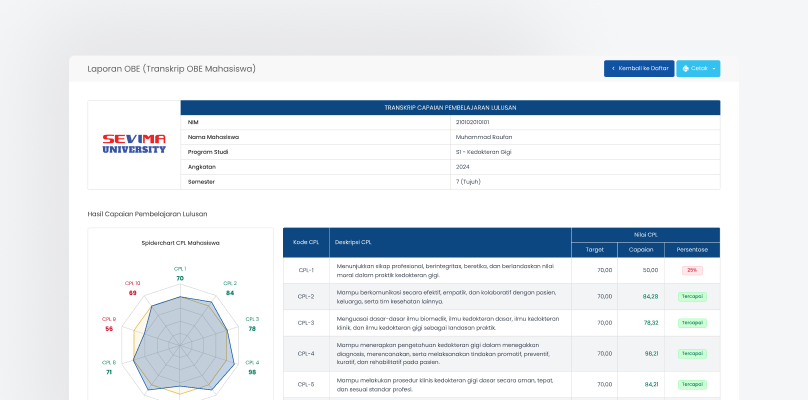Menjawab kebutuhan tersebut, SEVIMA resmi merilis Modul Outcome-Based Education (OBE) Versi 2.0. Pembaruan ini dirancang untuk membantu perguruan tinggi mengelola kurikulum secara lebih sederhana dan tertata, dengan kemudahan pemantauan capaian pembelajaran lulusan (CPL) di setiap program studi.