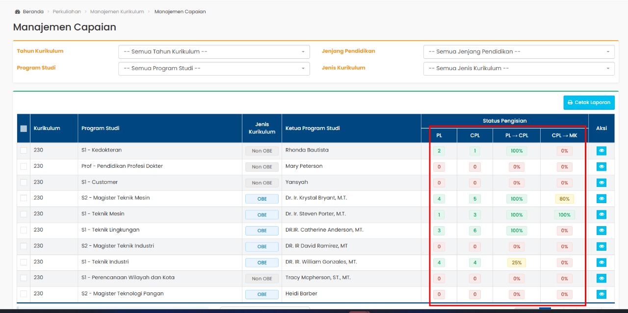 Selain itu, OBE V 2.0 juga dilengkapi dengan fitur cetak laporan monitoring OBE sesuai dengan kebutuhan: