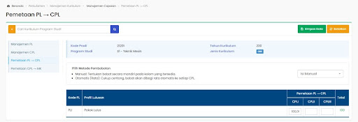 | CPL per Mata Kuliah | Analisis kontribusi Mata Kuliah (MK) terhadap Capaian Pembelajaran Lulusan (CPL) |