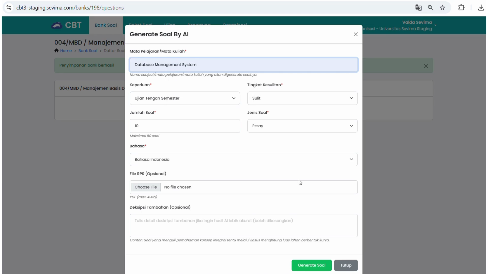 Memahami tantangan yang dihadapi dosen dalam menyusun soal ujian yang sesuai dengan Capaian Pembelajaran, SEVIMA Platform menawarkan solusi inovatif berupa AI Computer-Based Test (CBT). Fitur ini mempermudah dosen untuk menyusun soal ujian dengan lebih cepat dan tepat sasaran, tanpa harus mengorbankan kualitas dan relevansi soal terhadap materi pembelajaran yang diajarkan.