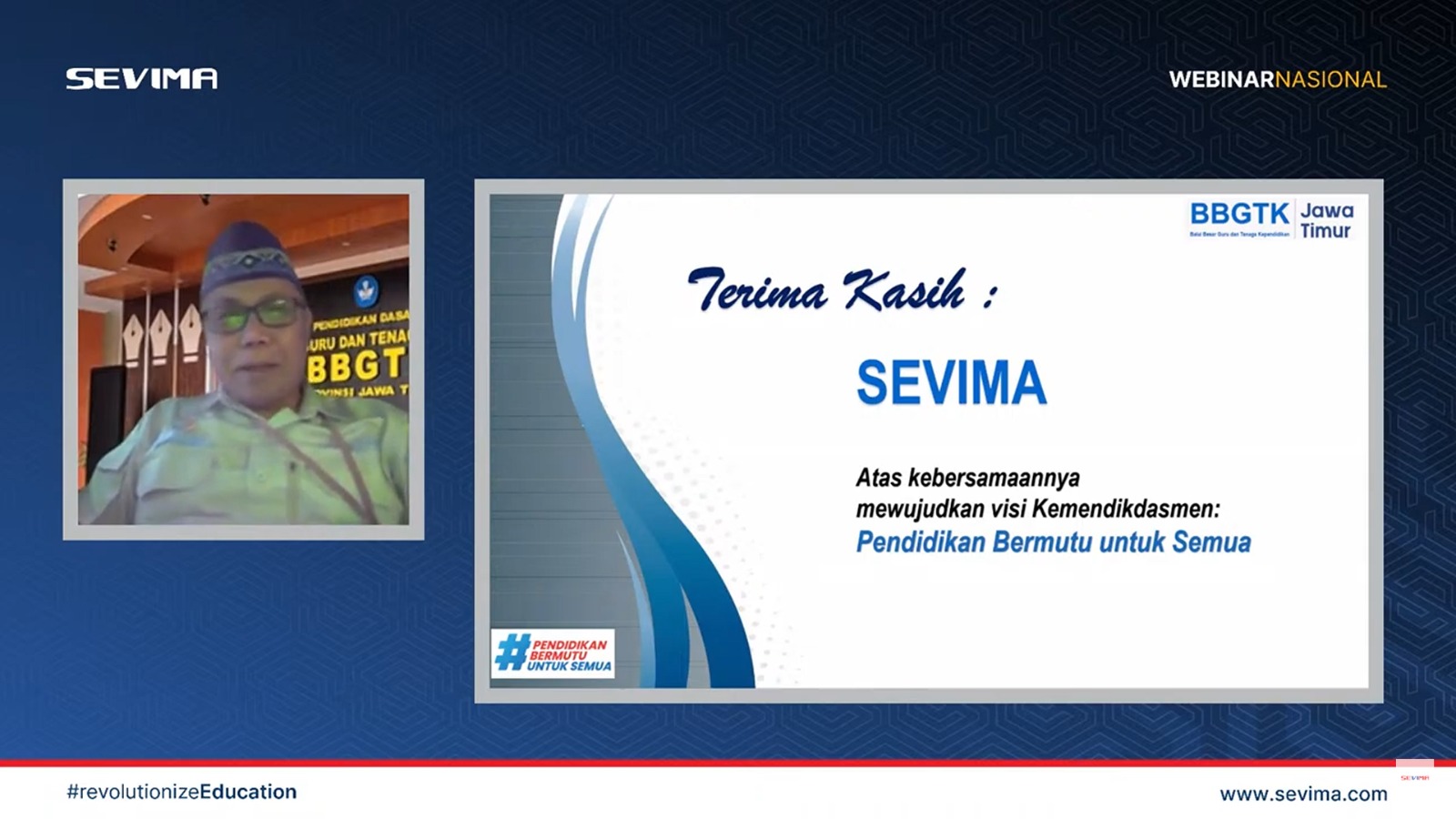 “Kami, atas nama Kementerian Pendidikan Dasar dan Menengah melalui BBGTK Jatim, mengucapkan ribuan terima kasih atas kebersamaan SEVIMA membersamai dalam mewujudkan visi kementerian, yakni pendidikan bermutu untuk semua,” kata Abu Khaer, saat webinar Kiat Sukses Tingkatkan Branding Sekolah dengan Digitalisasi dan Beasiswa, Selasa (26/8/2025).