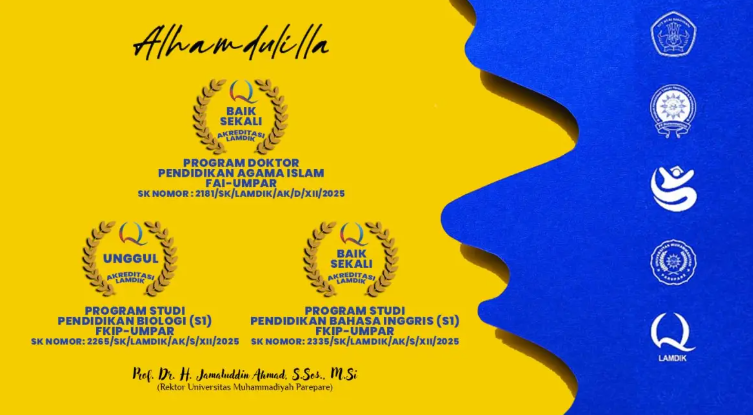 SEVIMA.COM – Universitas Muhammadiyah Parepare (UMPAR) menutup akhir tahun 2025 dengan capaian membanggakan setelah tiga program studi di lingkungan kampus memperoleh hasil akreditasi dengan predikat sangat memuaskan dari Lembaga Akreditasi Mandiri Kependidikan (LAMDIK). Penetapan akreditasi ini menjadi kado istimewa bagi seluruh sivitas akademika sekaligus penguatan mutu penyelenggaraan pendidikan di UMPAR.