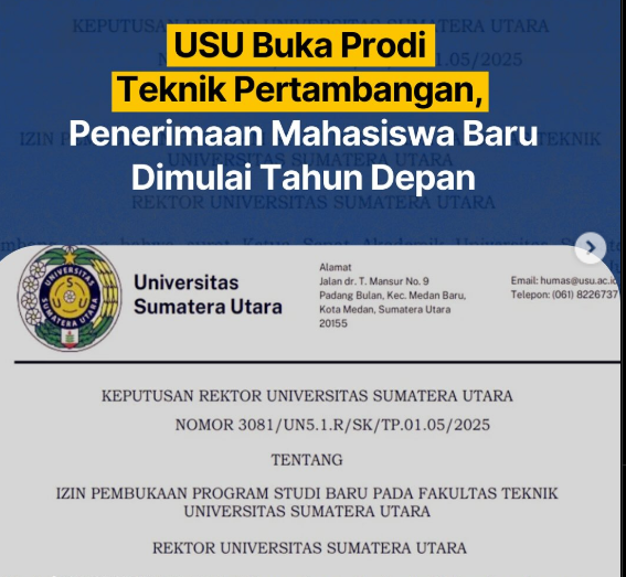 SEVIMA.COM – Universitas Sumatera Utara (USU) akan membuka Program Studi Strata 1 (S1) Teknik Pertambangan di bawah naungan Fakultas Teknik. Kepastian ini dituangkan dalam Surat Keputusan Rektor USU Nomor 3081/UN5.1.R/SK/TP.01.05/2025, tentang Izin Pembukaan Program Studi Baru pada Fakultas Teknik Universitas Sumatera Utara dengan rencana penerimaan mahasiswa baru dimulai pada tahun ajaran 2026/2027.