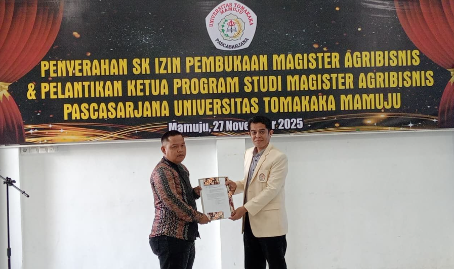 SEVIMA.COM – Universitas Tomakaka (Unika) Mamuju resmi membuka Program Studi Magister Agribisnis pada Program Pascasarjana. Peresmian ditandai dengan penyerahan Surat Keputusan (SK) sekaligus pelantikan Ketua Program Studi Magister Agribisnis yang digelar di Ruang Seminar Unika Mamuju, Kamis, 27/11/2025.