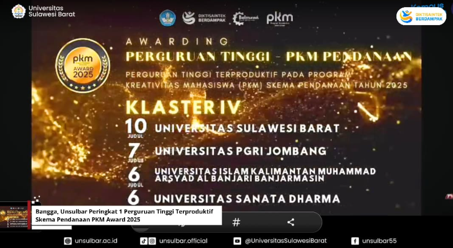 SEVIMA.COM – Prestasi baru Unsulbar dalam Program Kreativitas Mahasiswa (PKM) yang diselenggarakan Direktorat pembelajaran dan kemahasiswaan Diktisaintek raih penghargaan rangking satu sebagai Perguruan Tinggi Terproduktif Klaster empat skema Pendanaan PKM Award 2025