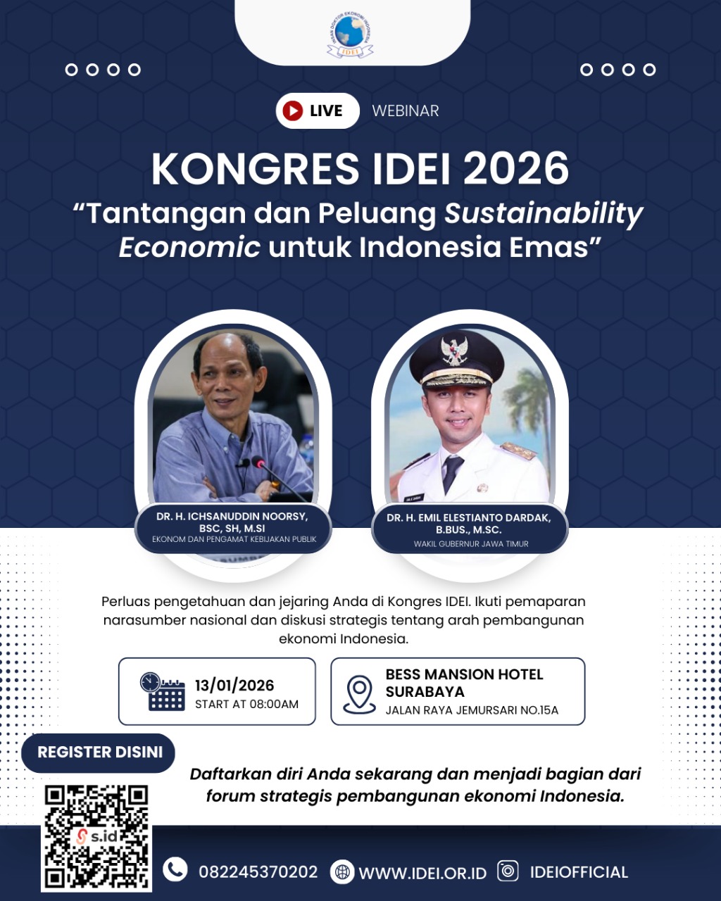 SEVIMA.COM – Ikatan Insan Doktor Ekonomi Indonesia (IDEI) akan menyelenggarakan Kongres IDEI 2026 pada 13 Januari di Bess Mansion Hotel, Surabaya. Acara ini menghadirkan pakar ekonomi nasional untuk membahas tantangan dan peluang keberlanjutan ekonomi menuju Indonesia Emas 2045. Forum tersebut ditargetkan menjadi ruang strategis bagi akademisi, peneliti, dan pemangku kebijakan dalam merumuskan arah pembangunan nasional.