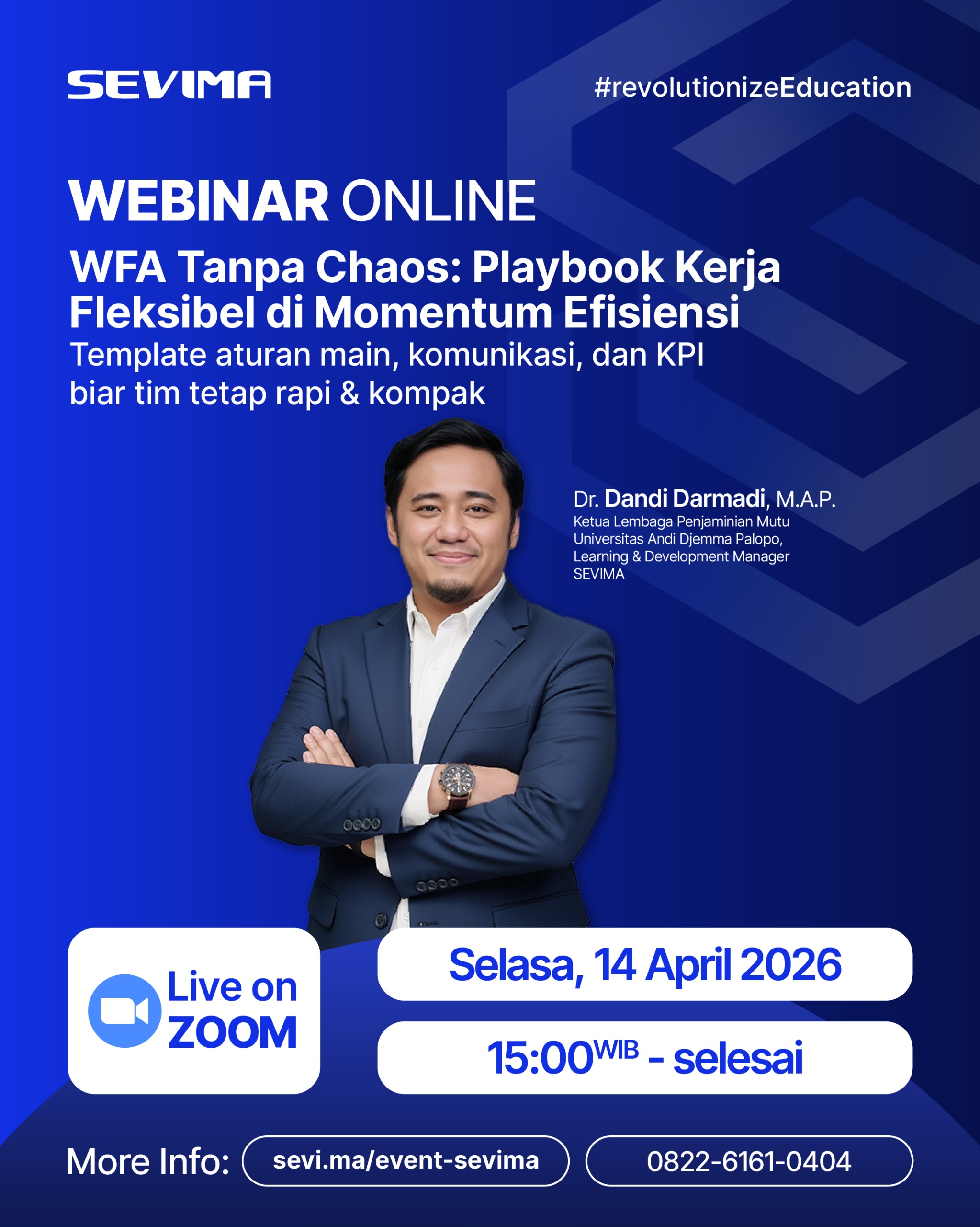 Insight akan disampaikan langsung oleh Dr. Dandi Darmadi, M.A.P., Ketua Lembaga Penjaminan Mutu Universitas Andi Djemma Palopo sekaligus Learning & Development Manager SEVIMA, yang memiliki pengalaman dalam pengembangan sistem kerja dan peningkatan kualitas SDM.